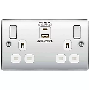 British General Nexus 13A 2-Gang SP Switched Socket + 3A 2-Outlet Type A & C USB Charger Polished Chrome with White Inserts