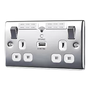 British General Nexus Metal 13A 2-Gang SP Switched Wi-Fi Extender Socket + 2.1A 1-Outlet Type A USB Charger Polished Chrome with White Inserts