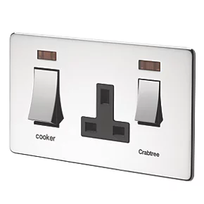Crabtree Platinum 45 A & 13A 2-Gang DP Cooker Switch & 13A DP Switched Socket Polished Chrome with Neon with Black Inserts