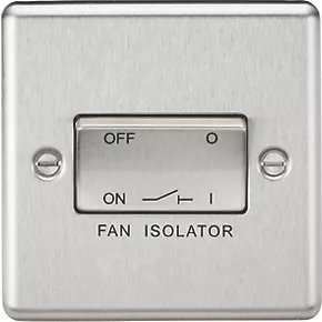 Raised, rounded-edge metal design with built-in gasket. Provides a safe and simple method of isolating fan units in rooms such as en-suite bathrooms, family bathrooms, utility rooms and store rooms. Matching metal rocker.
