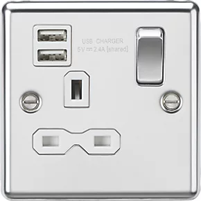 Knightsbridge CL9124PCW 13A 1-Gang SP Switched Socket + 2.1A 2-Outlet Type A USB Charger Polished Chrome with White Inserts