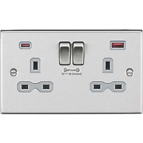 Knightsbridge CS9909BCG 13A 2-Gang DP Switched Socket + 4.0A 2-Outlet Type A & C USB Charger Brushed Chrome with Colour-Matched Inserts