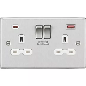 Knightsbridge CS9909BCW 13A 2-Gang DP Switched Socket + 4.0A 2-Outlet Type A & C USB Charger Brushed Chrome with White Inserts