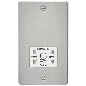 Flat plate, low profile metal design dual voltage shaver socket. Ideal for bathroom upgrades.