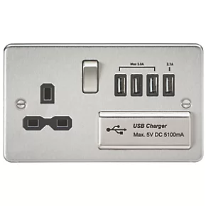 Knightsbridge FPR7USB4BC 13A 1-Gang SP Switched Socket + 5.1A 4-Outlet Type A USB Charger Brushed Chrome with Black Inserts