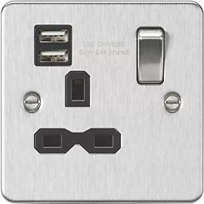 Knightsbridge FPR9124BC 13A 1-Gang SP Switched Socket + 2.4A 2-Outlet Type A USB Charger Brushed Chrome with Black Inserts