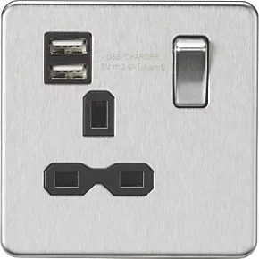 Knightsbridge SFR9124BC 13A 1-Gang SP Switched Socket + 2.4A 2-Outlet Type A USB Charger Brushed Chrome with Black Inserts