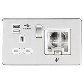 Flat profile, switched socket with USB features 3W RMS Bluetooth speaker with on/off button to connect via Bluetooth. Ideal for kitchens, bedrooms and hotel rooms.