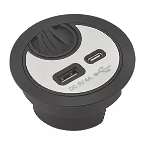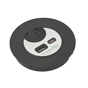 Desktop charger features 2 bezels (60mm and 80mm), ideal for adapting existing desk cut-outs when mounting in office desks. 2.5mm projection. Supplied with plug-in power supply. Minimum surface thickness 10mm.