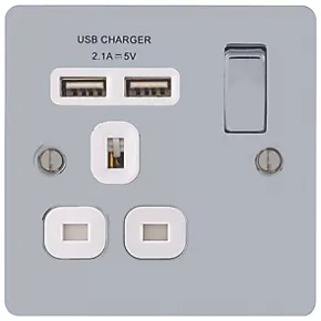 Minimal profile, decorative switched socket with 2 x USB charging ports. Features angled in-line terminals and includes backed out captive screws for easy installation. Ideal for charging iPad, iPhone, tablets, mobiles, cameras and more.