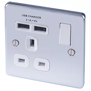 LAP 13A 1-Gang SP Switched Socket + 2.1A 2-Outlet Type A USB Charger Polished Chrome with White Inserts