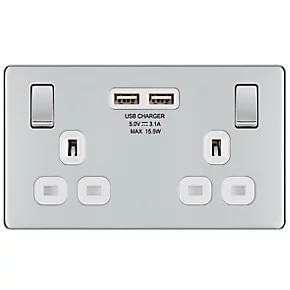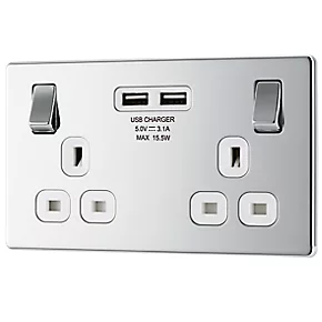 LAP 13A 2-Gang DP Switched Socket + 3.1A 2-Outlet Type A USB Charger Polished Chrome with White Inserts