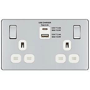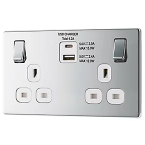 LAP 13A 2-Gang DP Switched Socket + 4.2A 2-Outlet Type A & C USB Charger Polished Chrome with White Inserts