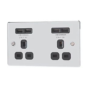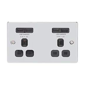 LAP 13A 2-Gang Unswitched Socket + 4.2A 4-Outlet Type A USB Charger Polished Chrome with Black Inserts