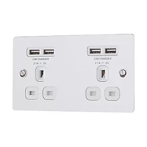 Decorative metal socket with 4 USB charging ports. Ideal for charging iPads, iPhones, tablets, mobile phones, cameras and MP3s. Features angled, in-line terminals and backed-out captive screws for easy installation. Integral moisture protection gasket.