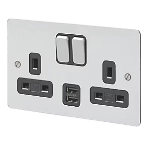 Contemporary switched socket with 2 USB ports. Upwards facing terminals with backed-out and captive screws for easy installation. Dynamic device recognition means the socket can detect different charging requirements and react accordingly for optimal charging efficiency. USB is protected against overload or short-circuit. 3-pin child-resistant shutter system is designed to inhibit access to the electricity supply unless all 3 pins are in position.