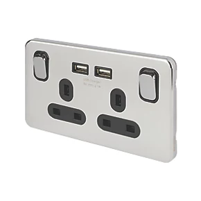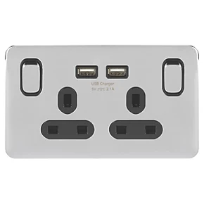 Schneider Electric Lisse Deco 13A 2-Gang SP Switched Socket + 2.1A 2-Outlet Type A USB Charger Polished Chrome with Black Inserts