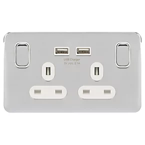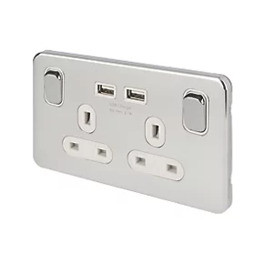 Schneider Electric Lisse Deco 13A 2-Gang SP Switched Socket + 2.1A 2-Outlet Type A USB Charger Polished Chrome with White Inserts