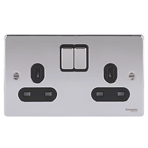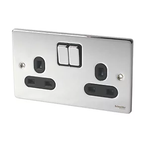 Schneider Electric Ultimate Low Profile 13A 2-Gang SP Switched Plug Socket Polished Chrome with Black Inserts