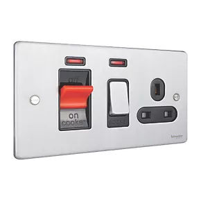Schneider Electric Ultimate Low Profile 45A 2-Gang DP Cooker Switch & 13A DP Switched Socket Brushed Chrome with Neon with Black Inserts